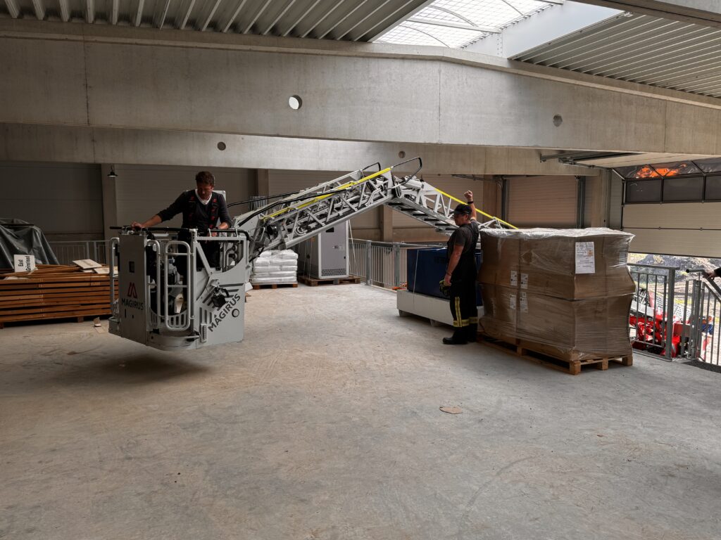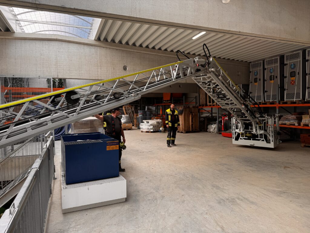 - Ausbildung Drehleiter: Taktische Aufstellung der Drehleiter in beengten Bereichen (hier in einer Halle) sowie Übung der Kommunikation zwischen Korb und Bedienstand bei für den Maschinisten nicht einsehbaren Bereichen.