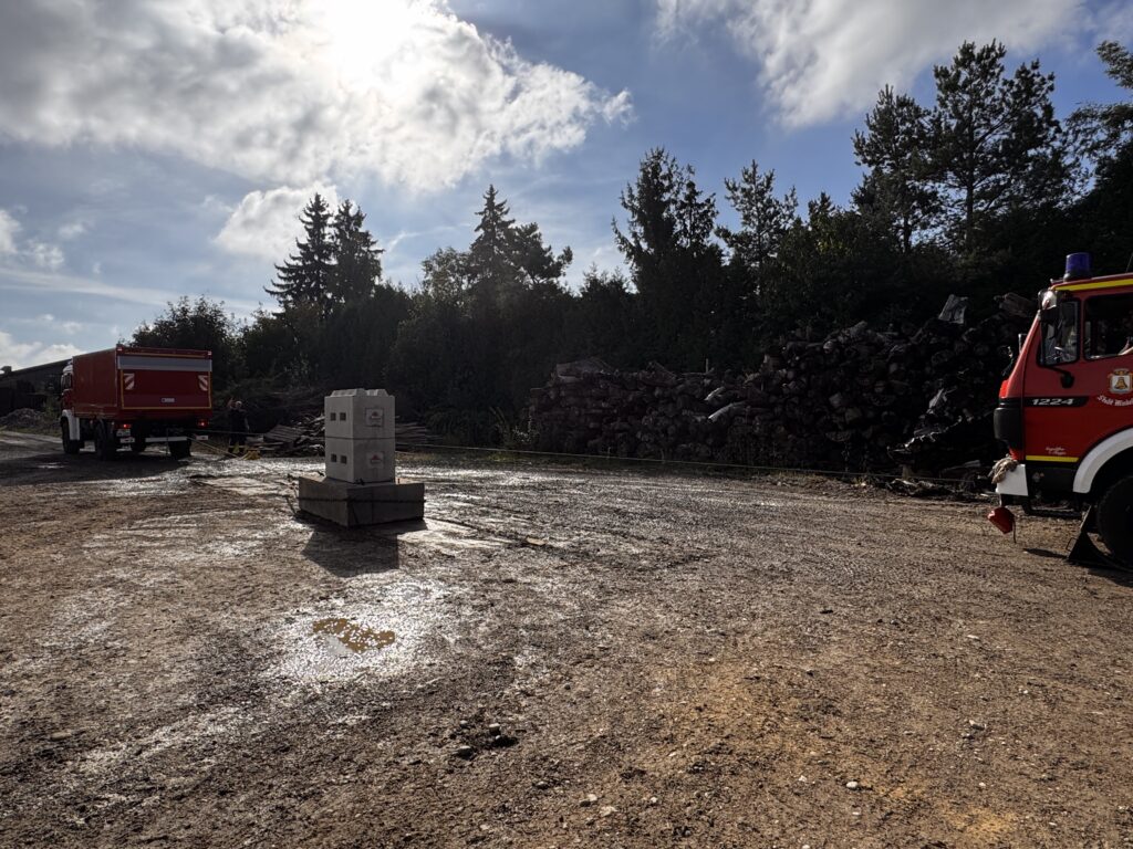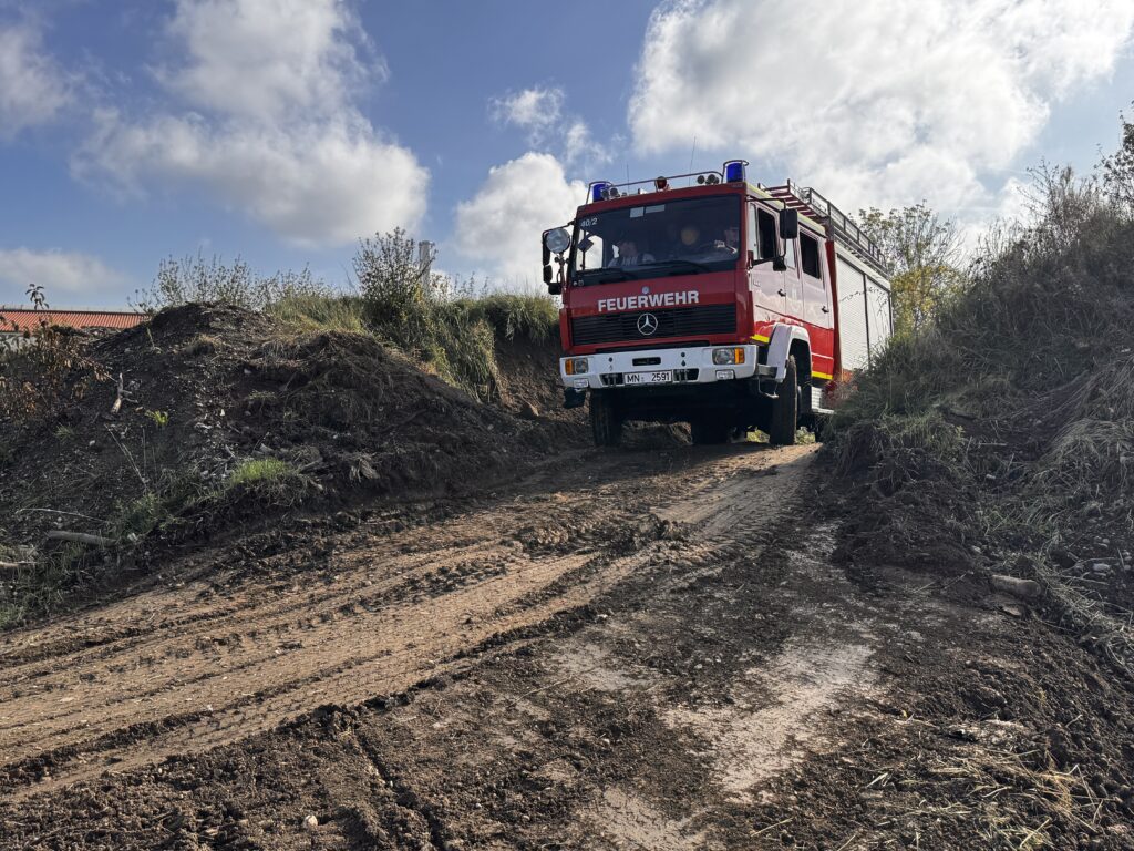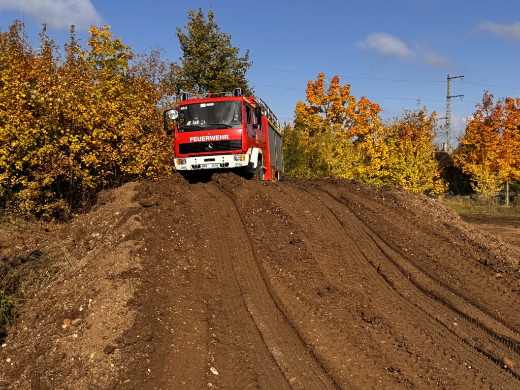 - Geländefahrtraining: Auf einer eigens von einigen Kameraden angelegte Geländestrecke mussten herausfordernde Steigungen, Schrägfahrten und Verschränkungspassagen auf unbefestigtem Untergrund mit einem Löschgruppenfahrzeug passiert werden. Ziel dabei war es, die Grenzen der Fahrzeuge kennenzulernen und Sicherheit im Gelände zu gewinnen.