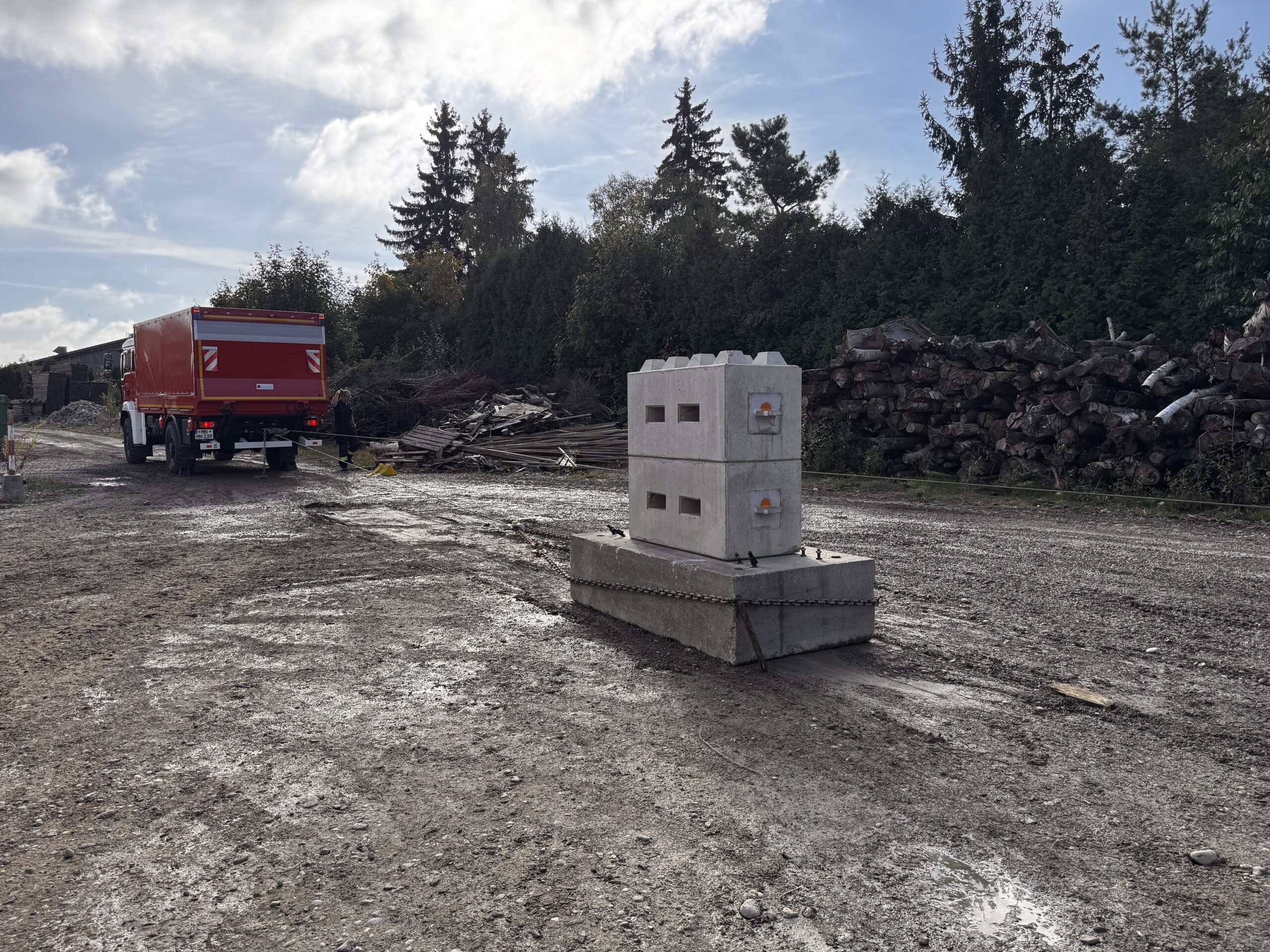 - Ausbildung Rüstwagen: Einsatz der Seilwinde bzw. Zugeinrichtung im Direktzug sowie mit Umlenkrollen im Normal- und Notbetrieb. Dabei wurden tonnenschwere Betonblöcke gezogen. Ein Ziel dabei war es, die Grenzen der Zugeinrichtung zu erfahren.