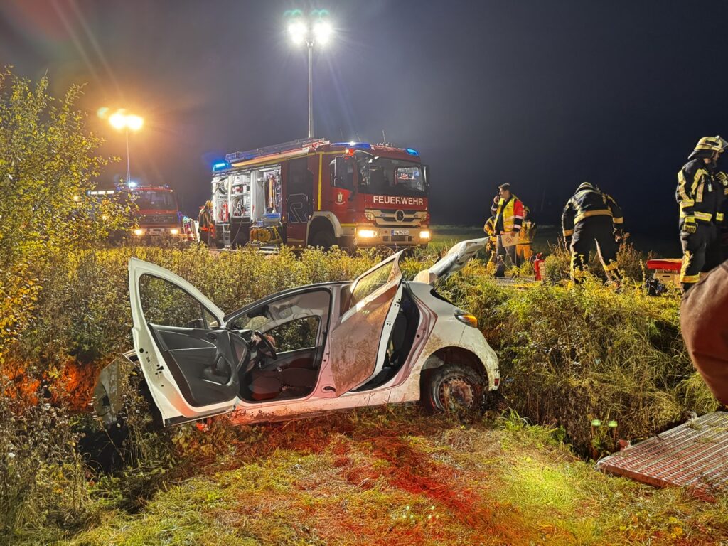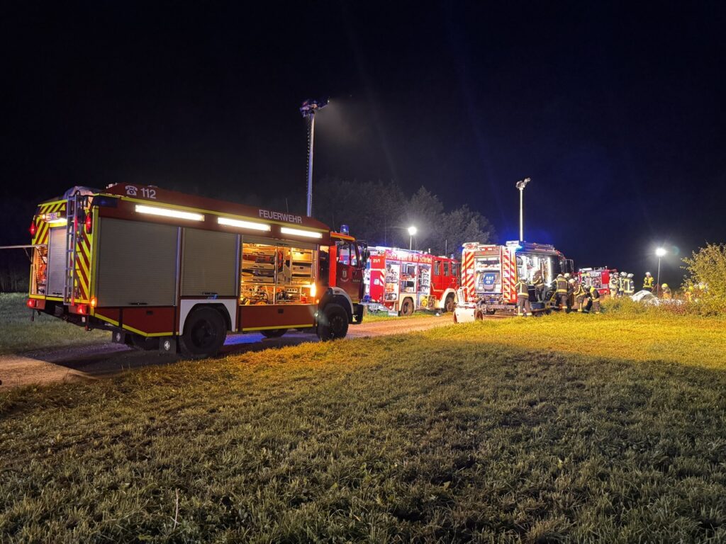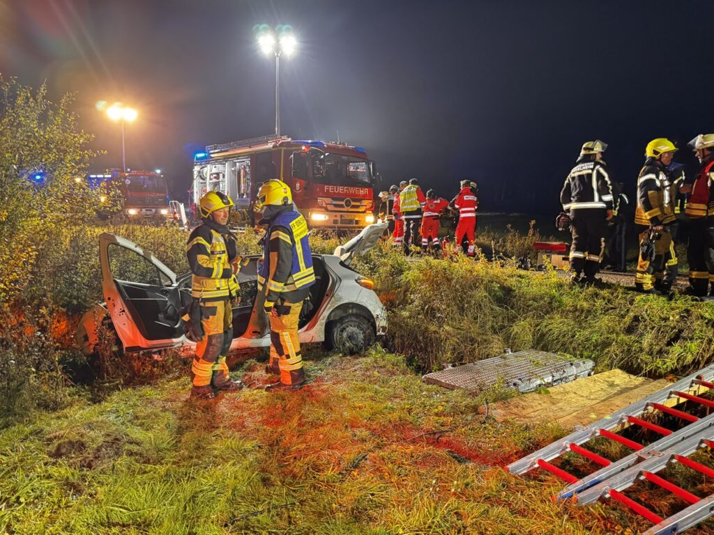 Alarmierung zu einem Verkehrsunfall mit eingeklemmter Person auf der Ortsverbindung zwischen Dirlewang und Wallenried. Ein mit fünf Personen besetzter Pkw war aus uns unbekannten Gründen von der Fahrbahn abgekommen kam im Graben zum Stillstand. Beim Eintreffen der ersten Einsatzkräfte konnten vier Personen den Pkw bereits selbständig verlassen. Eine Person befand sich noch im Fahrzeug und musste aufgrund des Verletzungsmusters nach enger Rücksprache mit dem Rettungsdienst schonend über ein Spineboard aus dem Fahrzeug transportiert werden. Wir unterstützten den Rettungsdienst bei der Versorgung der verletzten Personen. Dabei kam auch ein Infrarotstrahler zum Einsatz, der für den Wärmeerhalt der Patienten sorgte. Da sich zwischen Straße und Unfallfahrzeug ein Graben befand, wurde mit Steckleiterteilen, einer Rettungsplattform sowie dem Rüstholz des Rüstwagens eine improvisierte Brücke installiert, um das Unfallfahrzeug gut erreichen und die Patienten barrierefrei abtransportieren zu können. Zudem stellten wir den Brandschutz sicher und leuchteten die Unfallstelle entsprechend aus. Da es sich bei dem verunfallten Fahrzeug um ein Elektrofahrzeug handelte, kontrollierten wir den Pkw mit einer Wärmebildkamera auf eine mögliche Erwärmung der Hochvoltbatterie und betätigten die gekennzeichneten Hochvolt-Trennstellen. Zur Unfallursache ermittelt die Polizei. Ebenfalls im Einsatz befanden sich die Feuerwehren Dirlewang und Helchenried.
