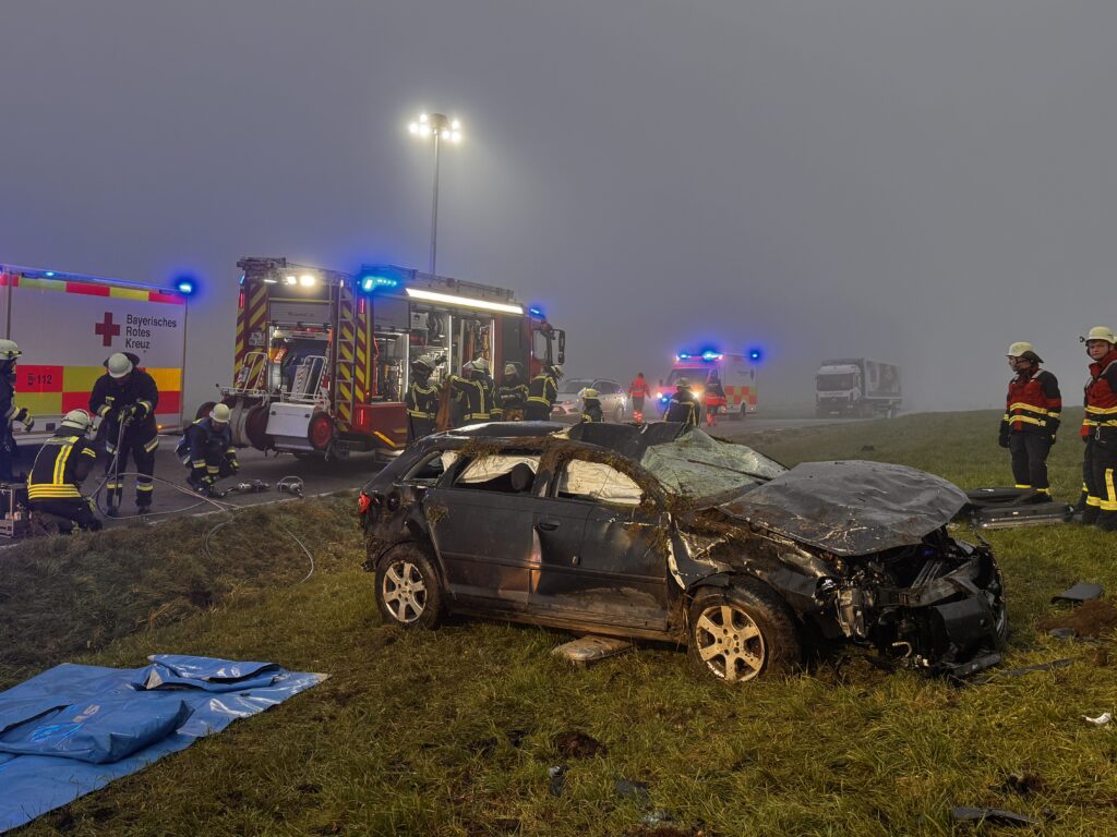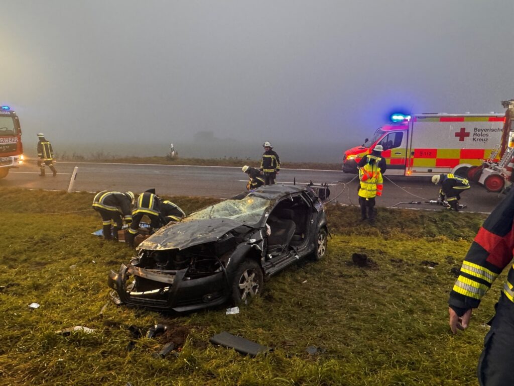 Alarmierung zu einem Verkehrsunfall mit eingeklemmter Person auf der Staatsstraße St2026 zwischen Hausen und Zaisertshofen. Ein Pkw war dort aus uns nicht bekannten Gründen von der Fahrbahn abgekommen und kam nach mehreren Überschlägen in der angrenzenden Wiese zum Stillstand. Eine Person war im Fahrzeug schwer verletzt eingeklemmt und musste mit hydraulischem Rettungsgerät befreit werden. Während sich die Feuerwehr Pfaffenhausen um die technische Rettung kümmerte, sorgten wir mit einem Infrarotstrahler bei den niedrigen Temperaturen für den Wärmeerhalt der verunfallten Person. Zudem unterstützten wir mit dem Führungstrupp Mehrzweckfahrzeug die Einsatzleitung der Feuerwehr Hausen bei der Kommunikation mit der Leitstelle. Neben den Feuerwehren Hausen, Salgen, Pfaffenhausen und Mindelheim befanden sich auch mehrere Einheiten des Rettungsdienstes und der Polizei, die zur Unfallursache ermittelt, im Einsatz.